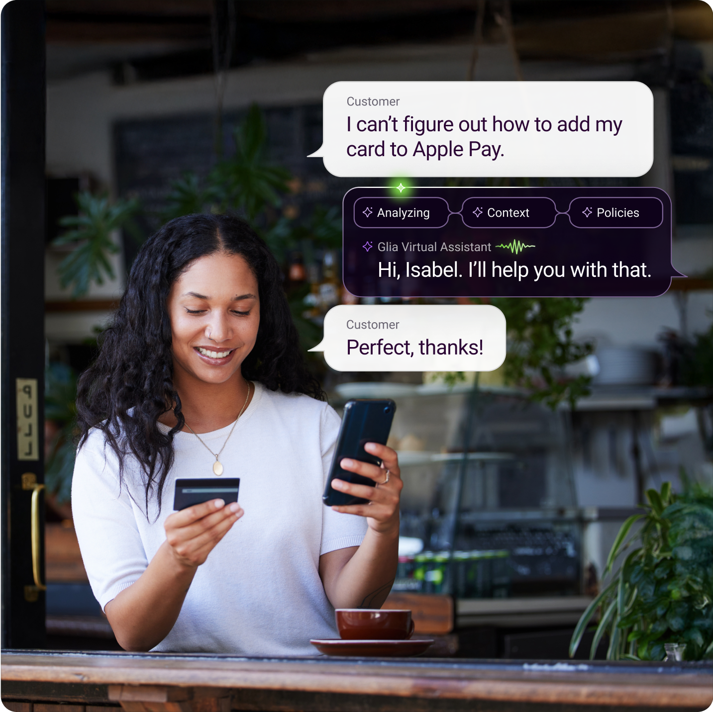 Faster service that doesn’t compromise CX? Now we’re talking. Glia Virtual Assistants listen and speak like humans so you can drive efficiency without driving away customers.
